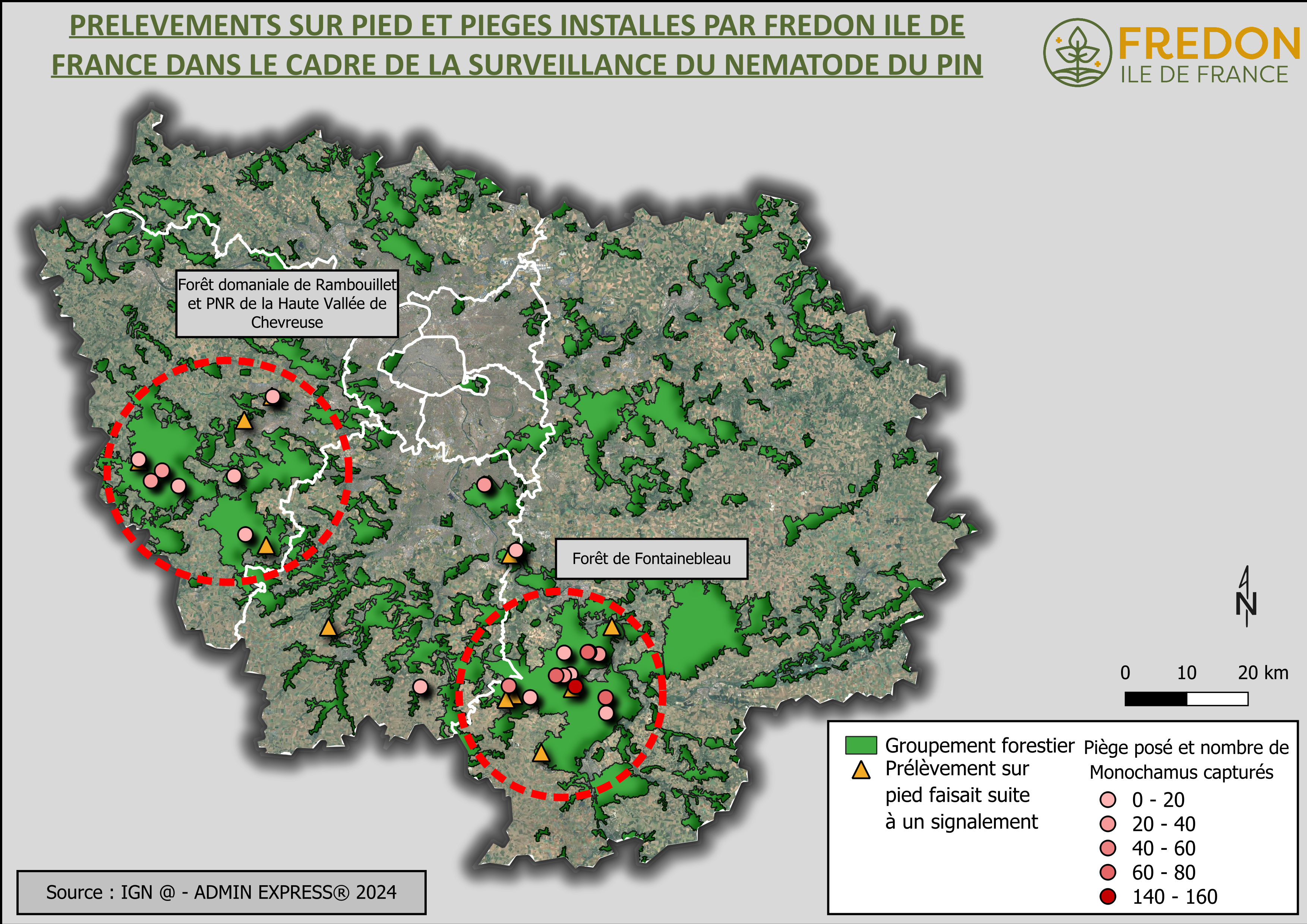 Des pièges de type Crosstrap sont installés à proximité de forêts sensibles composées en partie de résineux, comme la forêt de Fontainebleau, de Rambouillet ou encore de Sénart. Ces pièges ont pour but la capture de Monochamus, vecteur du nématode du pin. Les coléoptères capturés sont envoyés au laboratoire de référence pour recherche du nématode du pin au sein des insectes.